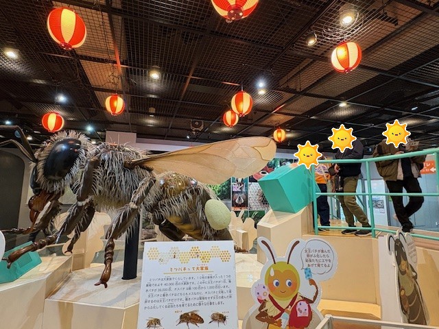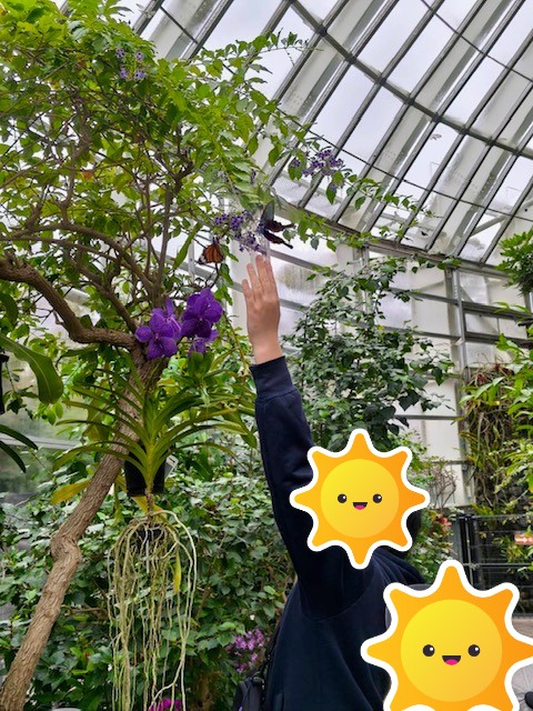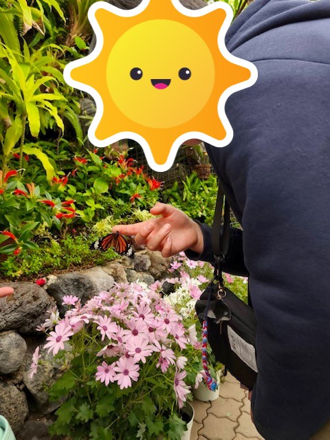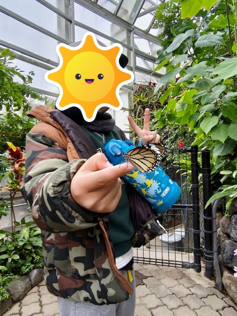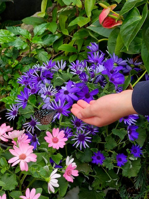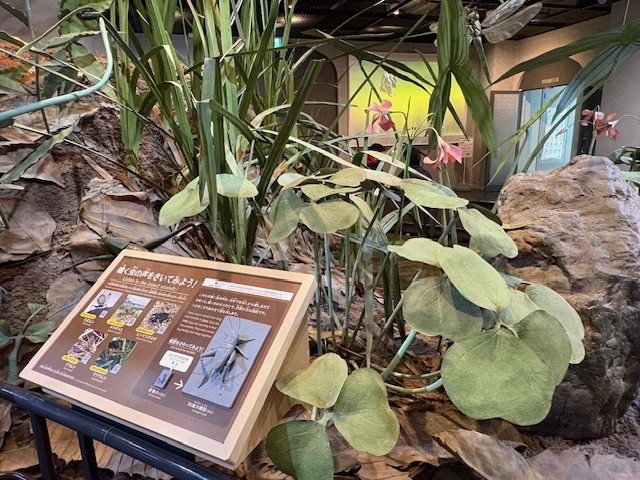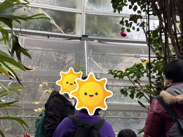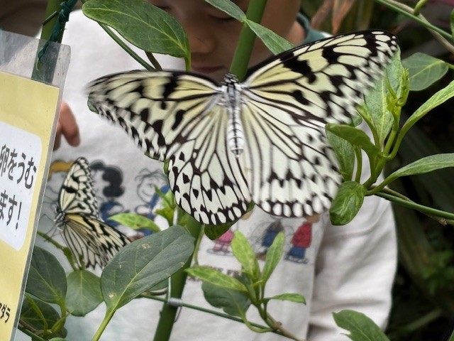 大きな昆虫のレプリカやたくさんの蝶が飛び交う温室